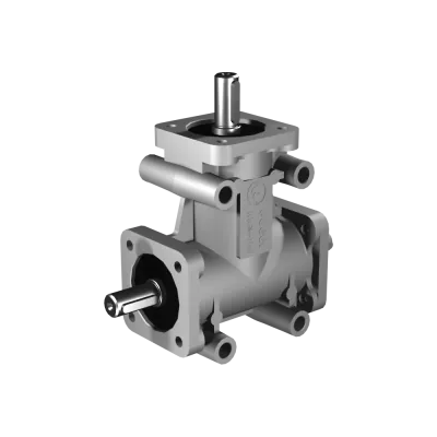 Das Modell 2008 von Poggi bietet eine 3-Wege-Anordnung mit einem Übersetzungsverhältnis von 1:1 und Ø14h7 Wellenschnittstellen (D1/2). Das leichte Aluminiumgehäuse sorgt für ein ausgewogenes Verhältnis zwischen Festigkeit, geringem Gewicht und Wärmewirkung. Das Getriebe ist mit Spiralkegelrädern ausgestattet, die eine reibungslose, geräuscharme und effiziente Drehmomentübertragung gewährleisten. Vollständig abgedichtet und lebensdauergeschmiert, bietet dieses Getriebe eine langlebige, wartungsfreie Leistung in Produktionsumgebungen mit hohen Zyklen.
