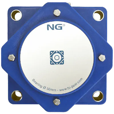 NGB50F40The NG waterproof flange bearing F4 with a shaft size of Ø50 and an IP66/67 rating features an open cover design, making it an ideal choice for industries with stringent hygiene standards. The bearing housing is crafted from blue polyurethane (PUR), ensuring robust, corrosion-resistant performance, while the stainless steel bearing delivers exceptional durability and reliability. The blue housing color aids in the quick detection of dirt, promoting a cleaner and safer production environment
