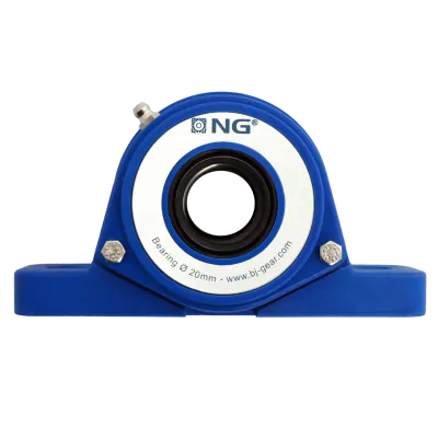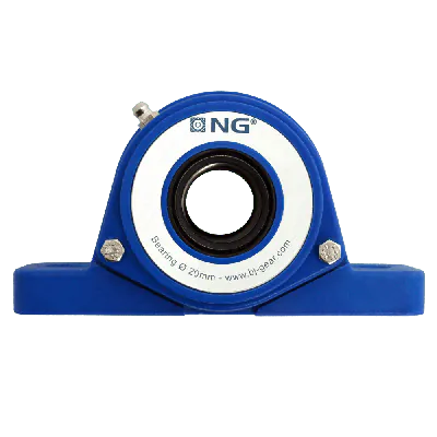 NGB20SF21The NG waterproof pillow block bearing SF2, designed for a Ø20 shaft with a open cover, is an exceptional choice for industries that prioritize hygiene and durability, like food processing. Made from high-quality blue polyurethane (PUR), this bearing housing is corrosion-resistant and crafted to handle demanding environments. With an IP66/67 rating, it’s protected against dust and water, even under high-pressure cleaning conditions. The blue color allows for quick identification of dirt and debris, helping to maintain a clean workspace. This bearing also features steel-reinforced mounting holes for enhanced durability and comes equipped with stainless steel bolts, nuts, and spacers designed for easy cleaning access.