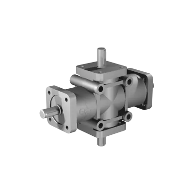 Compact 4-way right angle gearbox with 1:1 gear ratio
